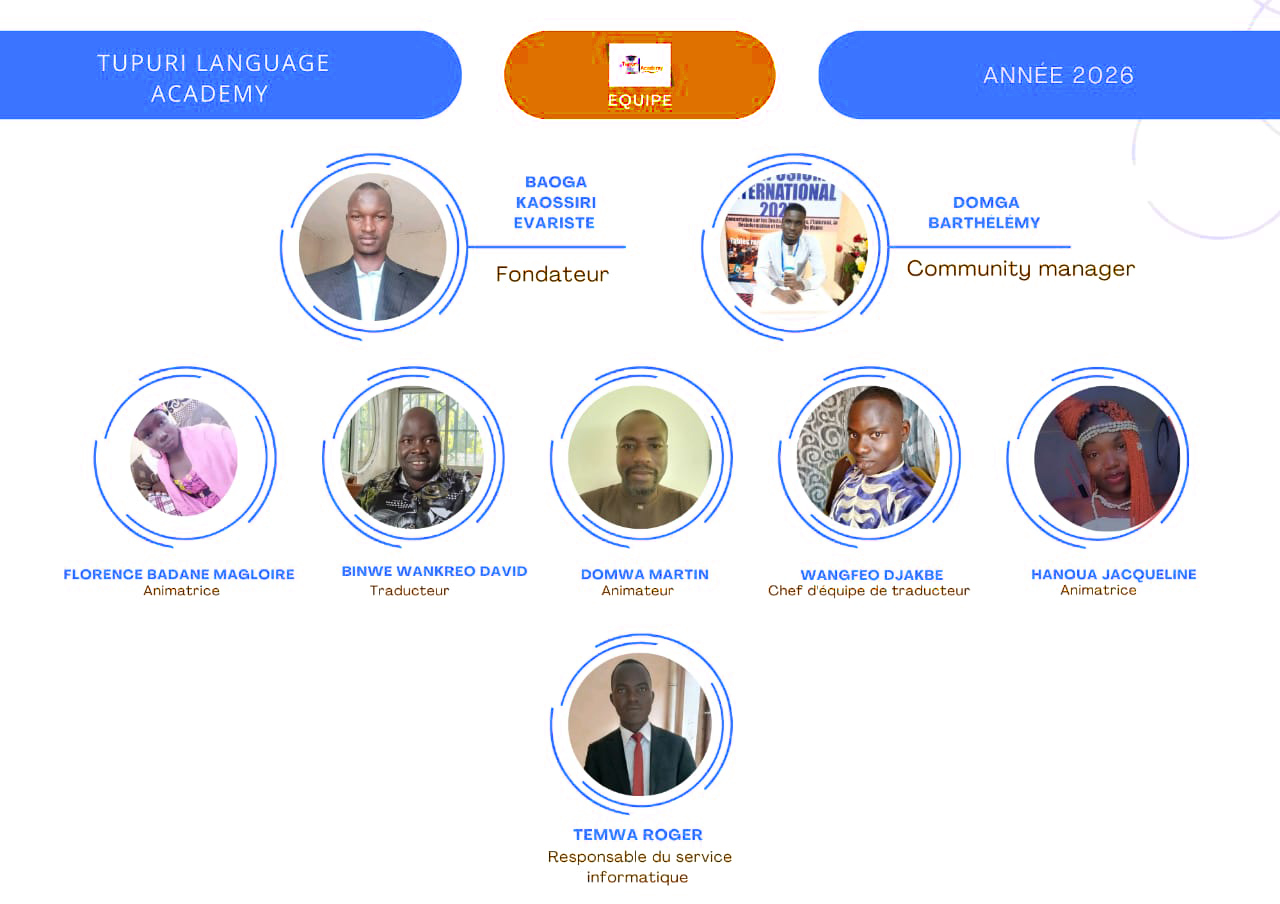 Nous respectons et soutenons la langue Tupuri. Nous affirmons la valeur inhérente de cette langue et de chaque communauté linguistique, l’autodétermination des peuples et les droits de cette communauté à utiliser, promouvoir et transmettre cette langue de génération en génération.